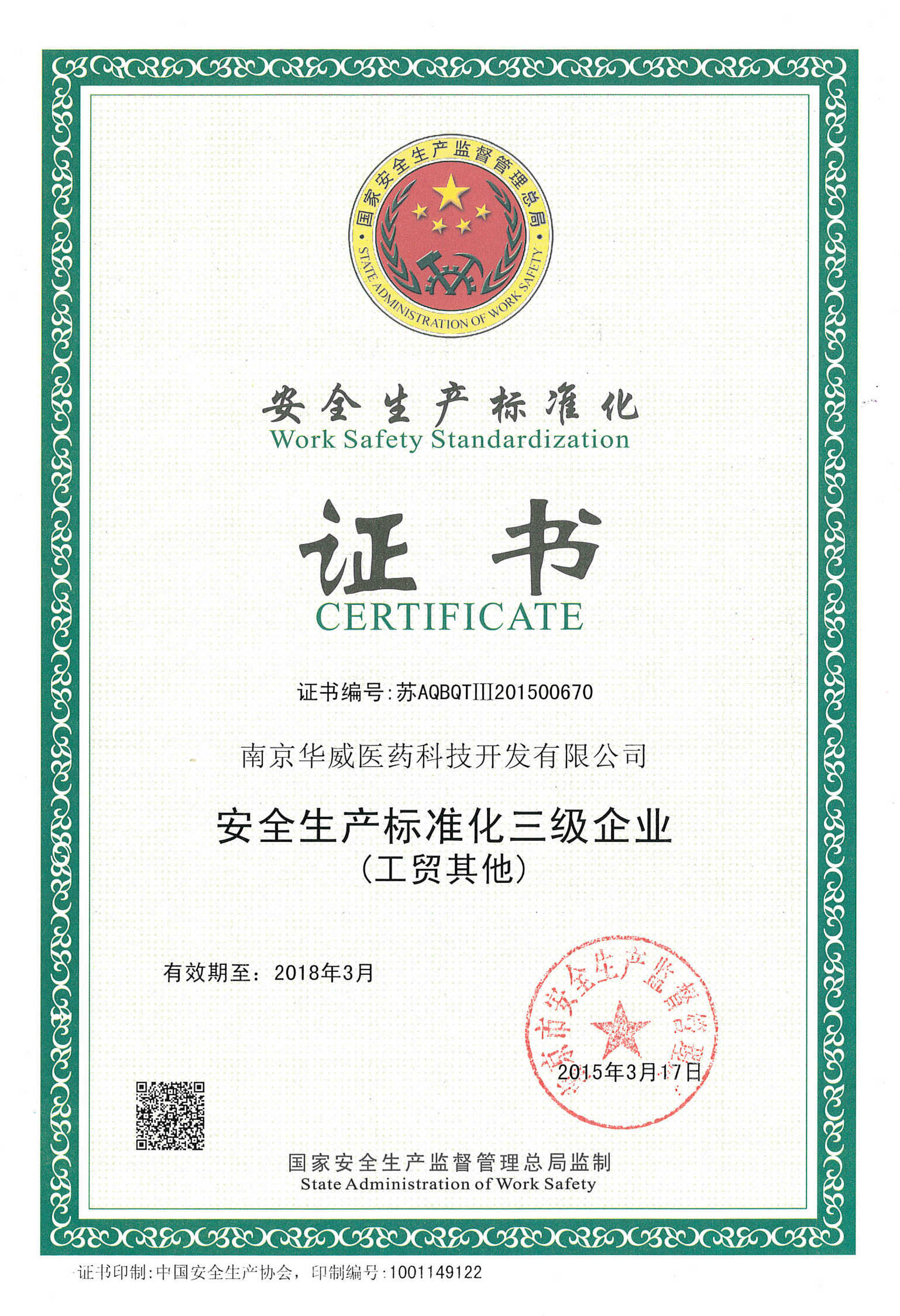近日,华威医药接获南京市安全生产监督管理局通知,华威医药通过了“冶金等工贸企业三级安全生产标准化”达标审查。2014年,根据国家安全监管总局《全国冶金等工贸企业安全生产标准化考评办法》(安监总管四〔2011〕84号)、《关于印发冶金等工贸企业安全生产标准化建设评审工作管理办法的通知》(安监总管四〔2011〕87号)的有关规定和要求,我司通过建立安全生产责任制,制定安全管理制度和操作规程,排查治理隐患和监控重大危险源,建立预防机制,规范生产行为,使各生产环节符合有关安全生产法律法规和标准规范的要求,人、机、物、环处于良好的生产状态,并持续改进,不断加强企业安全生产规范化建设。