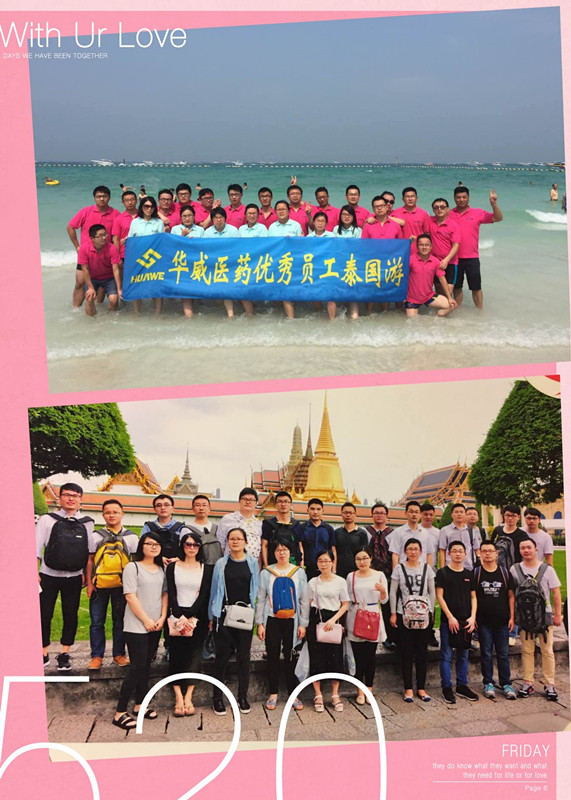 为表彰华威医药2015年度优秀员工,第二批25名优秀员工在2016年11月18日踏上了为期6天素有“微笑之国”的泰国之旅。同事们参观了皇室大王宫、玉佛寺,感受佛教为泰国人的国教,体验暹罗风情--长尾船游湄南河水上市场,风情园感受泰国泼水节,探险船大战鳄鱼湖,喂鳄鱼,骑大象,乘快艇乘风破浪直飞芭堤雅的珊瑚岛和金沙岛,欣赏了当地特色,人妖歌舞表演秀等多彩活动。