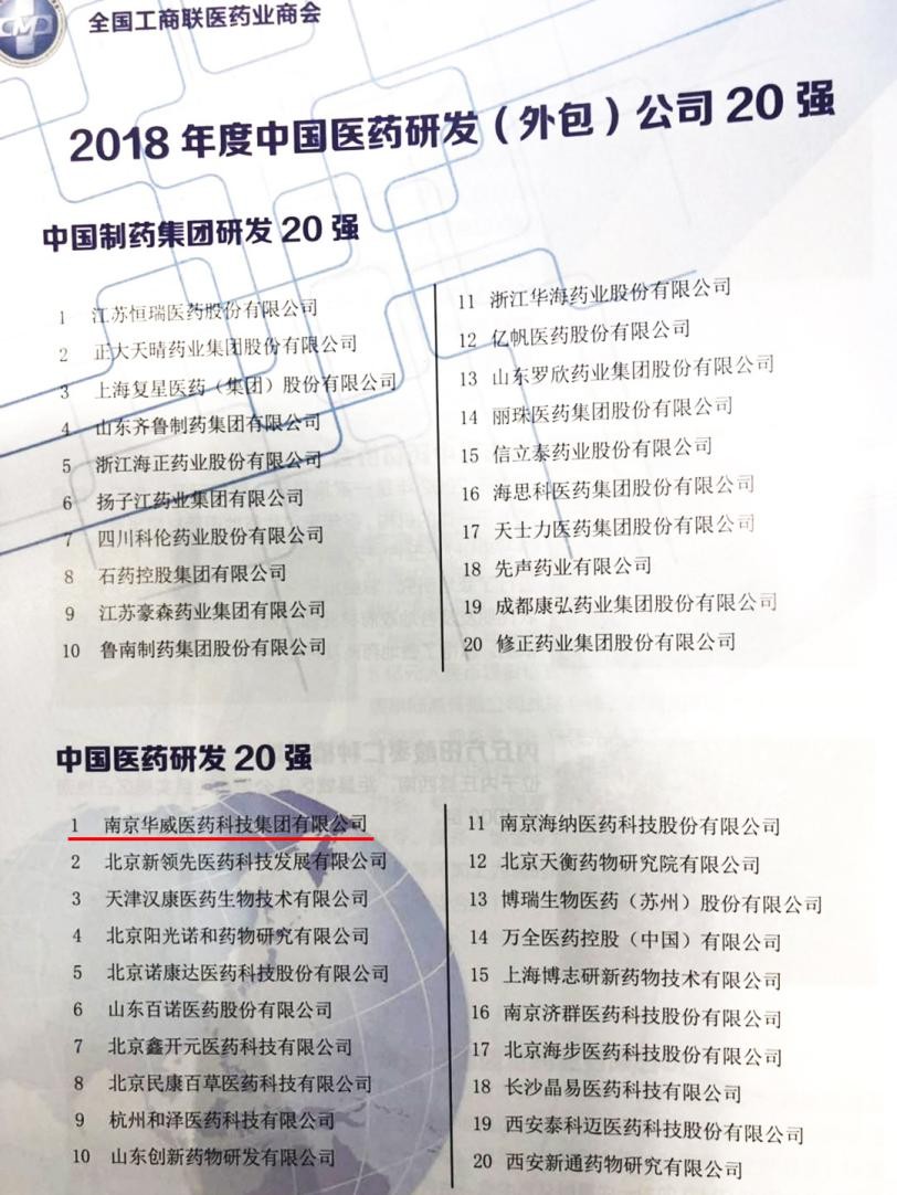 此次榜单发布会共发布了2018年度中国医药工业百强、中国医药行业成长50强、中国医药行业10大新领军人物等十二项榜单。南京华威医药科技集团有限公司(以下简称华威医药)凭借自身的雄厚实力,连续3届荣获2018年度“中国医药研发20强”榜首。