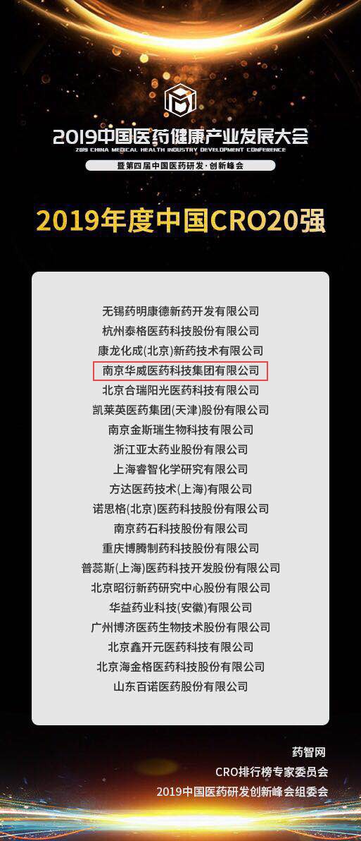 值得关注的是,2019年度中国CRO20强榜单是从企业的销售额、利润、研发投入、细分领域等多个维度综合打分评选出的。此次华威医药再次入选榜单前20强实属不易,这对华威而言是荣誉,更是我们砥砺前行的动力和压力。未来,华威医药将始终向前,一如既往为合作伙伴提供专业的药品研发服务和一体化的解决方案,为中国医药研发事业贡献自己的力量。