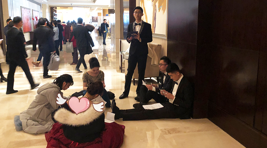 排队等待餐厅开门的主持人们,席地而坐,一遍又一遍地对着主持台本,只为将最好状态呈现在华威的年会舞台上~