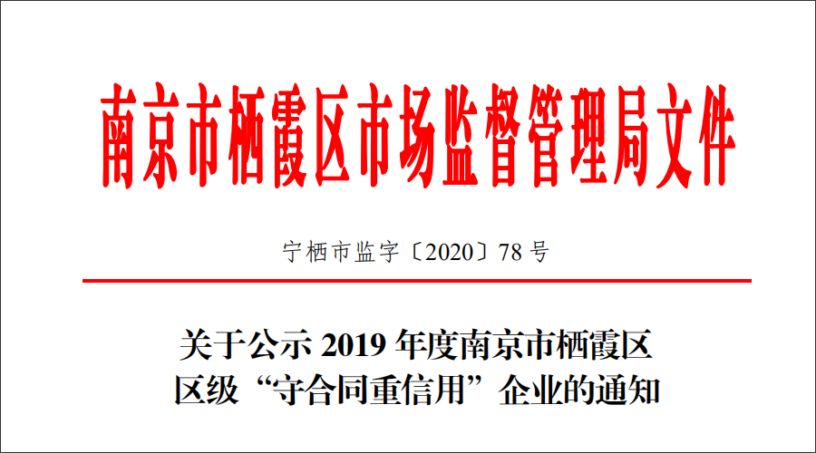 近日,为进一步推进企业诚信建设,规范企业合同行文,引导企业诚信履约、守法经营。根据《南京市市级守合同重信用企业公示办法》 的相关规定,南京市栖霞区市场监督管理局特向社会公示,确定南京华威医药科技集团有限公司等101家企业入选 2019 年度南京市栖霞区区级“守合同重信用”企业。