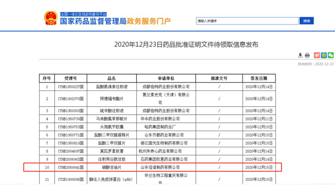 2020年12月23日,国家药品监督管理局正式发布通知,华威医药受上药集团山东信谊制药有限公司委托的硝酸甘油片(0.5mg)项目通过一致性评价,这是国内第二家通过硝酸甘油片一致性评价的企业。
