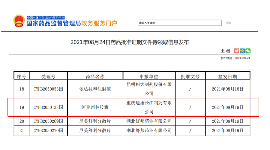 2021年8月19日,国家药品监督管理局正式发布通知,重庆迪康长江制药有限公司申报的阿莫西林胶囊正式通过仿制药质量和疗效一致性评价。