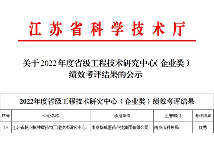 近日,根据《关于下放省级工程技术研究中心和省级企业人才站点管理权限的通知》(苏科条发[2015]136号)的有关规定,江苏省科技厅委托各设区市科技局对其辖区内省级工程技术研究中心(企业类,总计1117家)进行了绩效考评。经各主管部门发布通知、材料审核、专家咨询、现场核查、网上公示等流程,确定南京华威医药科技集团有限公司在内的20家省级工程技术研究中心(企业类)绩效考评优秀!