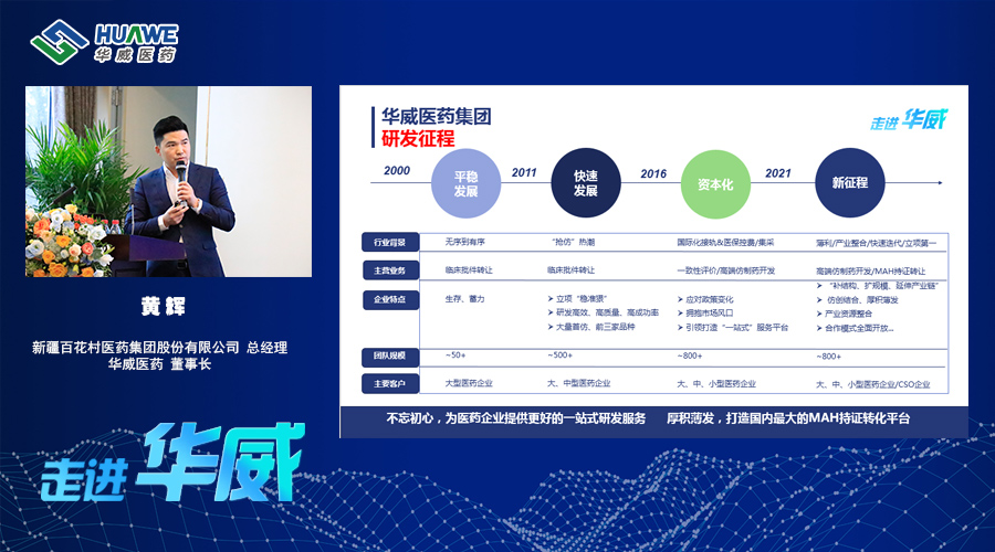 11月8日,华威医药联合前途汇隆重举行“走进华威,邀您共行”的研讨开放日活动,邀请百名医药行业翘楚齐聚金陵、共话发展。新疆百花村医药集团股份有限公司(股票代码600721)总经理、南京华威医药集团董事长黄辉在大会上全面讲述了华威医药的转型发展之路,全方位介绍了华威医药集团的研发部署、研发优势、项目经验以及管理举措等。