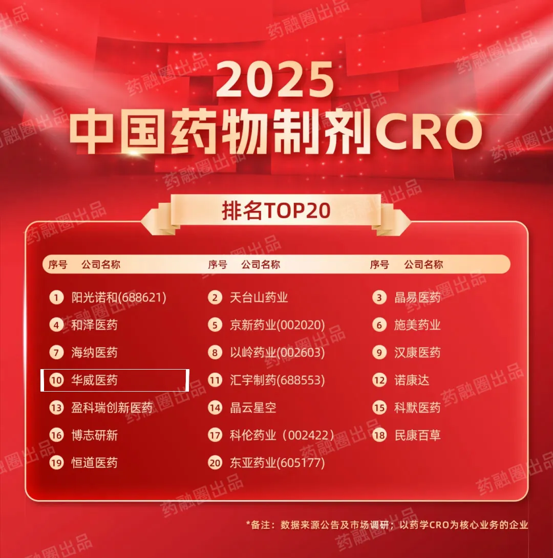 8月1日,在2025CMC-CHINA第七届中国制药工业博览会的盛典上,备受行业瞩目的《2025年中国制药工业TOP101》及10大核心产业链榜单正式揭晓?;揭┢窘枳吭降淖酆鲜盗?,一举斩获三项重磅荣誉:强势入选“2025中国药物制剂CRO排名TOP20”、总经理焦培想女士荣膺“中国医药CRO企业领军创始人”称号、同时获评“药融圈2025生态合作伙伴”。三大奖项的加冕,全面彰显了华威医药在技术研发、领导力建设及产业协作方面的标杆地位。